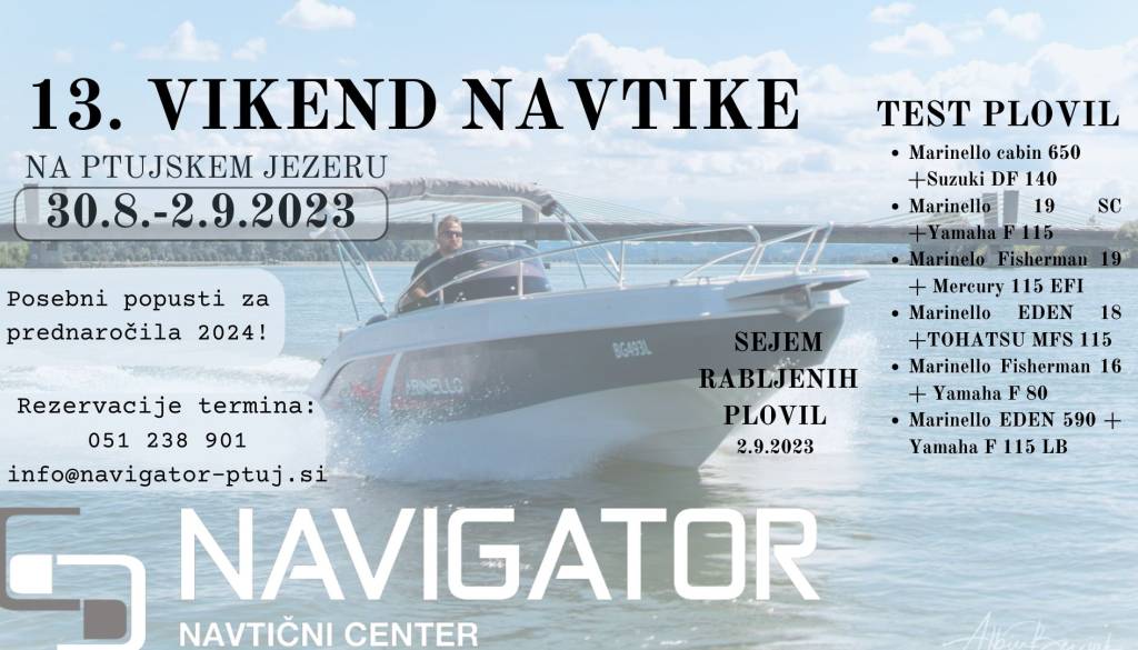 Ptujsko morjeVabljeni na tradicionalen vikend navtike, kjer bo mogoče testirati plovila Marinello ter si ogledati sejem rabljenih plovil. Vstop brezplačen.