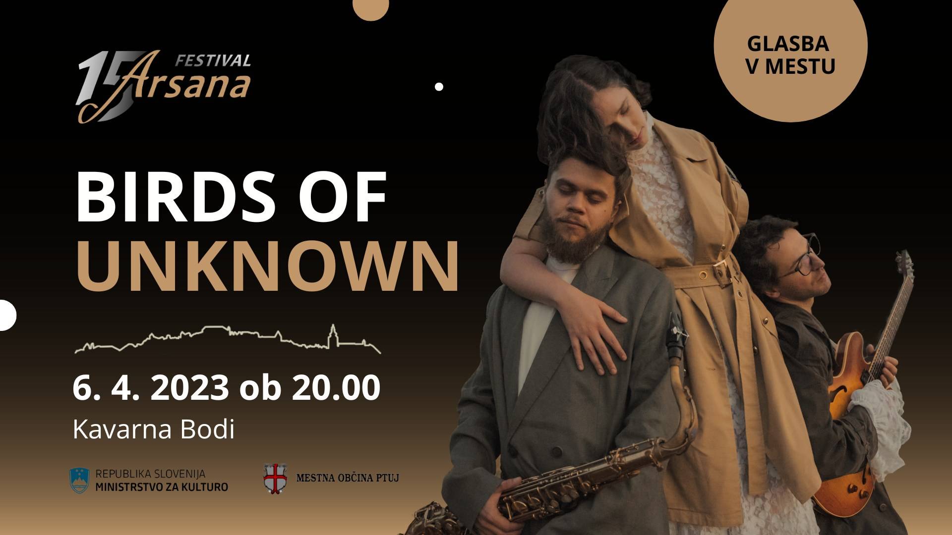 Člani tria birds of unknown so se v zadnjih letih urili pri priznanih mentorjih in na uveljavljenih univerzah (Zasebna glasbena univerza Gustava Mahlerja v Celovcu, Michael Erian; Univerza za glasbo in upodabljajočo umetnost v Gradcu, Dena DeRose; Univerza Antona Brucknerja v Linzu, Peter O’Mari). Svoje moči so združili leta 2020, ko se je Tibor Pernarčič pridružil takratnemu duetu Patricije Škof in Tilna Beigota. Navdih za svojo glasbo jemljejo predvsem iz jazza, avantgarde, soula in etno glasbe. Trio, v katerem nadarjeni glasbeniki prepletajo kitaro, saksofon in glas, je debitantsko nastopil maja 2020 v oddaji RTV Slovenije Prva Vrsta. Njihov singel iz junija 2020 je dobil častno mesto na kompilaciji Stereo Isolation festivala Jazz 'ma mlade, kar je bil le začetek njihove uspešne poti. Nadarjeni glasbeniki so nastopili na številnih domačih in tujih dogodkih in festivalih, med katerimi so med drugim Jazz Festival Ljubljana, JazzWerkstatt Graz, Jazzinty, Jazz ‘ma mlade, Zvončki in trobentice in Festival Lent. V letu 2021 so si prislužili mesto med finalisti Klubskega maratona Radia Študent, leta 2022 pa so bili izbrani kot slovenski predstavniki mednarodnega projekta Footprints Europe.