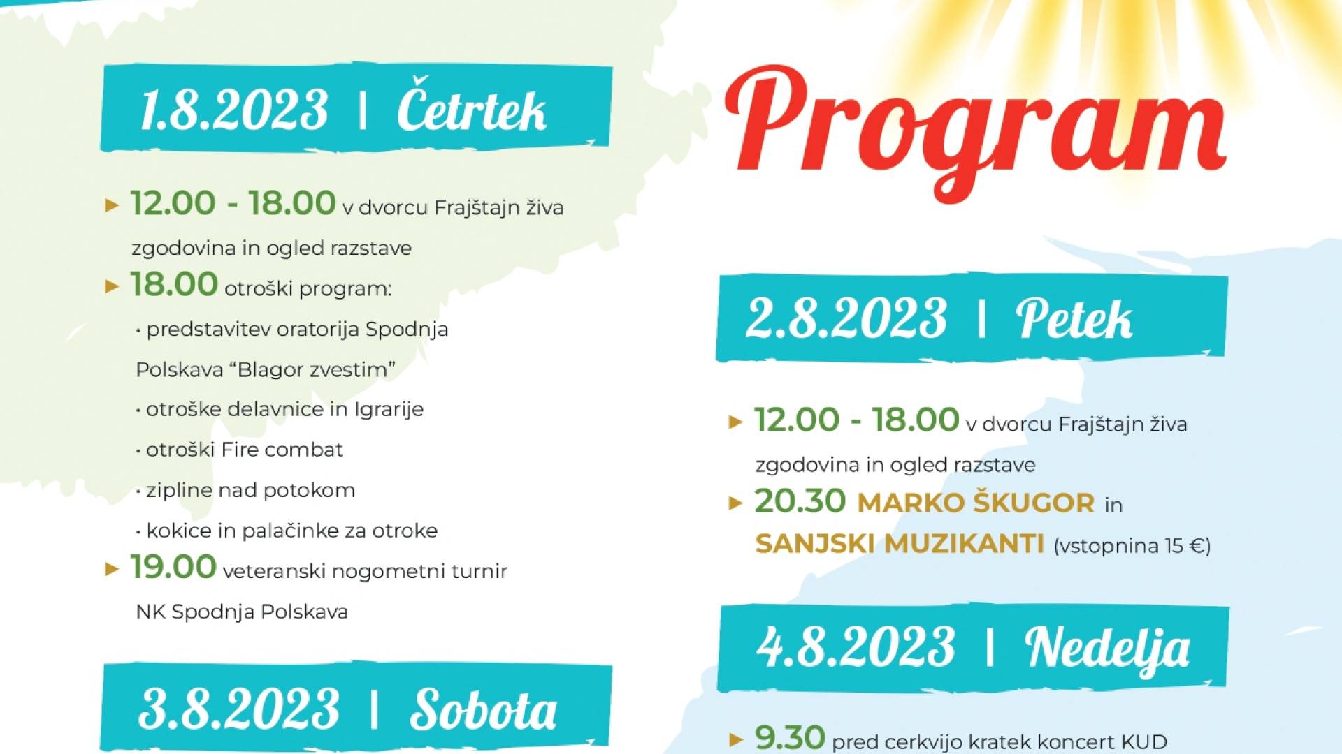 24. Spodnjepolskavsko poletje 2024 nikocergoli | 26. junij 2024 20:37 v Ostalo Termin Četrtek, 1. avgust 2024 12:00 - Nedelja, 4. avgust 2024 23:59 Lokacija Spodnja Polskava, Slovenska Bistrica Vljudno vabljeni.