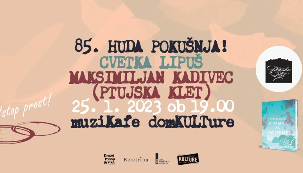 Muzikafe📅 Na domačem terenu ob domačih vinih. Skupaj z 𝐌𝐚𝐤𝐬𝐢𝐦𝐢𝐥𝐣𝐚𝐧𝐨𝐦 𝐊𝐚𝐝𝐢𝐯𝐜𝐞𝐦 iz Ptujske vinske kleti in pesnico 𝐂𝐯𝐞𝐭𝐤𝐨 𝐋𝐢𝐩𝐮𝐬̌ se bomo poslovili od lanske sezone Hudih pokušenj! in otvorili novo sezono s pokom! Vabljeni na 85. Hudo pokušnjo!, ki bo potekala 𝐯 𝐬𝐫𝐞𝐝𝐨, 𝟐𝟓. 𝐣𝐚𝐧𝐮𝐚𝐫𝐣𝐚, 𝐨𝐛 𝟏𝟗. 𝐮𝐫𝐢, 𝐯 𝐃𝐨𝐦𝐮 𝐊𝐔𝐋𝐓𝐮𝐫𝐞 𝐦𝐮𝐳𝐢𝐊𝐚𝐟𝐞 𝐧𝐚 𝐏𝐭𝐮𝐣𝐮. Literarno-vinski večer bosta povezovala 𝐊𝐫𝐢𝐬𝐭𝐢𝐧𝐚 𝐊𝐨𝐜̌𝐚𝐧 in vinski publicist 𝐉𝐨𝐳̌𝐞 𝐑𝐨𝐳𝐦𝐚𝐧.