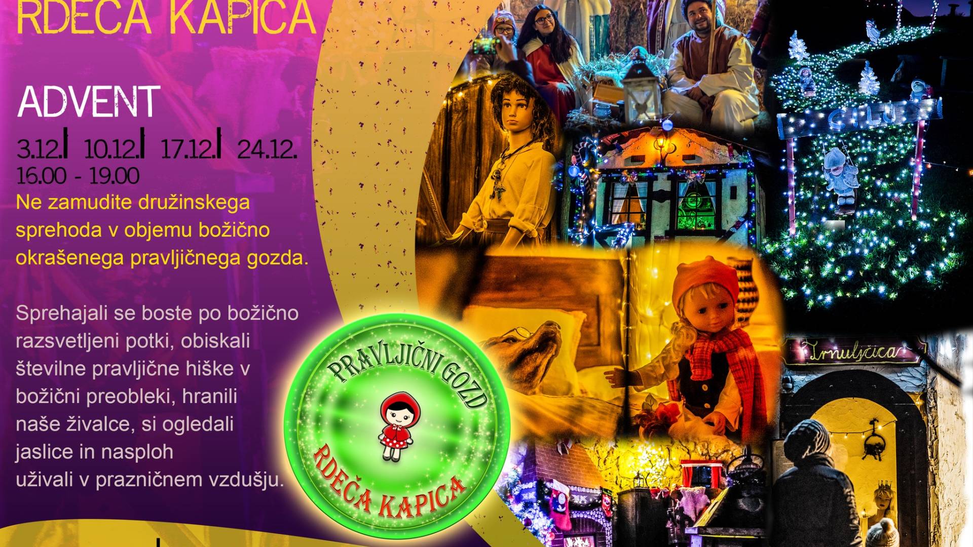 Pravljični gozd Rdeča kapica - Mohorkova grabaNe zamudite adventa v Pravljičnem gozdu Rdeča kapica. Z družino bodite del edinstvenega in pristnega doživetja v objemu prazničnih lučk in pravljičnih bitij.