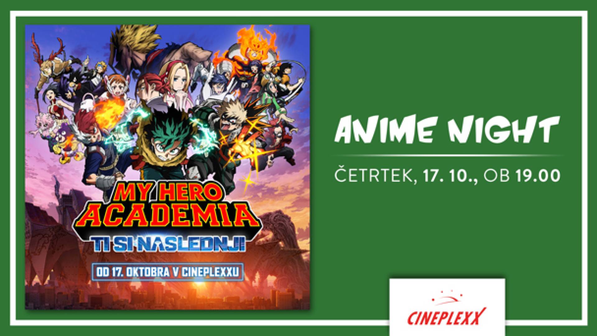 Cineplexx MariborPridruži se nam na ANIME NIGHTU, s filmom MY HERO ACADEMIA: TI SI NASLEDNJI v četrtek, 17. oktobra 2024, ob 19.00, v Cineplexxu Maribor!