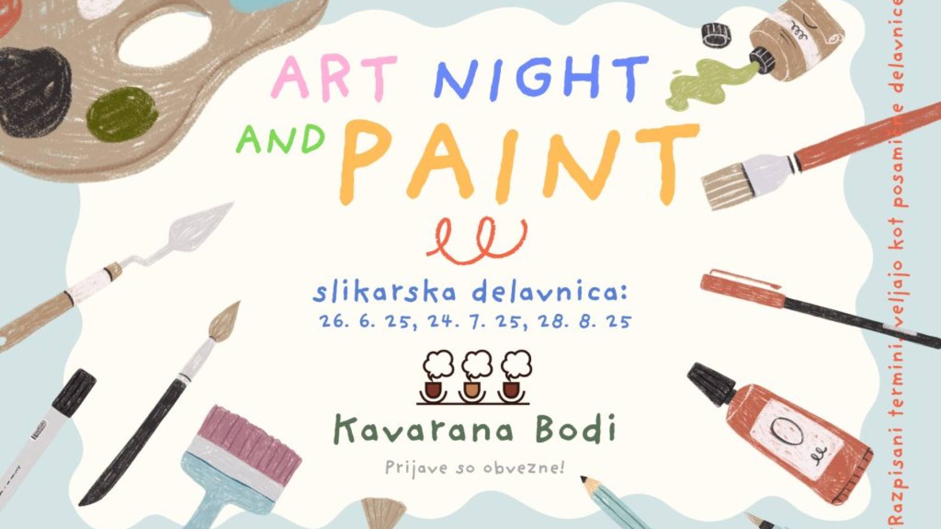 Kavarna BodiVeseli smo, da se želiš pridružiti naši kreativni delavnici Artnight & Paint, ki bo potekala v prijetnem ambientu Kavarne Bodi na Ptuju.