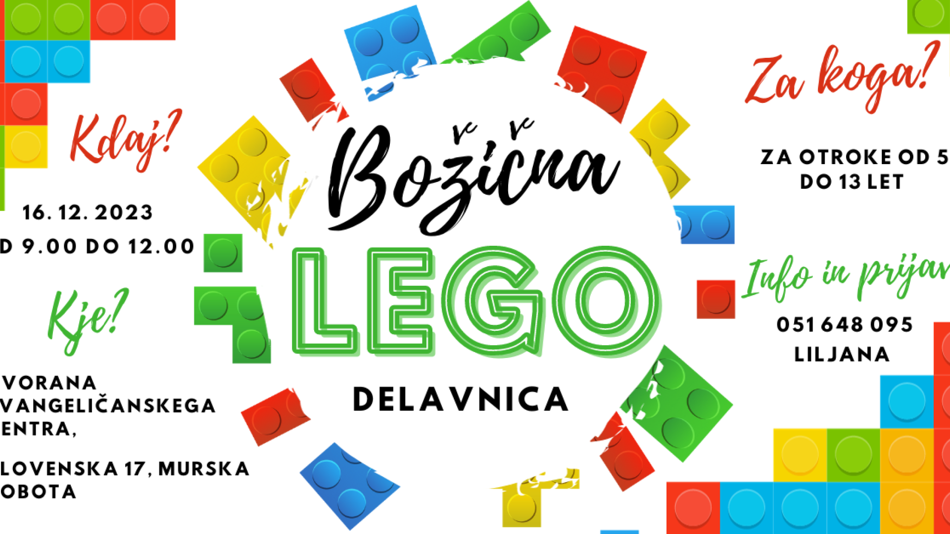 Dvorana Evangeličanskega centra Murska SobotaOtroci, stari od 5 do 13 let prisrčno vabljeni na božično Lego delavnico. Ustvarjali bomo s priljubljenimi gradniki, prisluhnili zgodbi o prvem božiču in se zabavali.