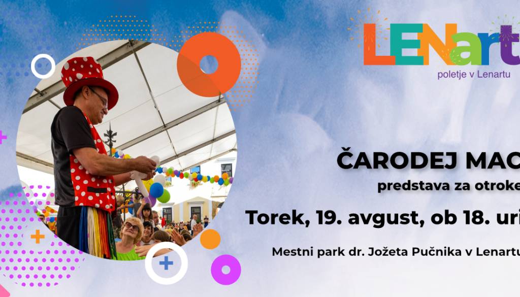 MESTNI PARK DR. JOŽETA PUČNIKA LENARTČarodej Mac bo očaral in začaral majhne in velike. S triki in vragolijami, ki vzamejo dih. Vidno postane nevidno, v rokavu se skriva presenečenje, »čudeži« se vrstijo. Kot bi mignil odpihne žalost, nariše nasmeh na obraz in pričara nepozabno vzdušje.