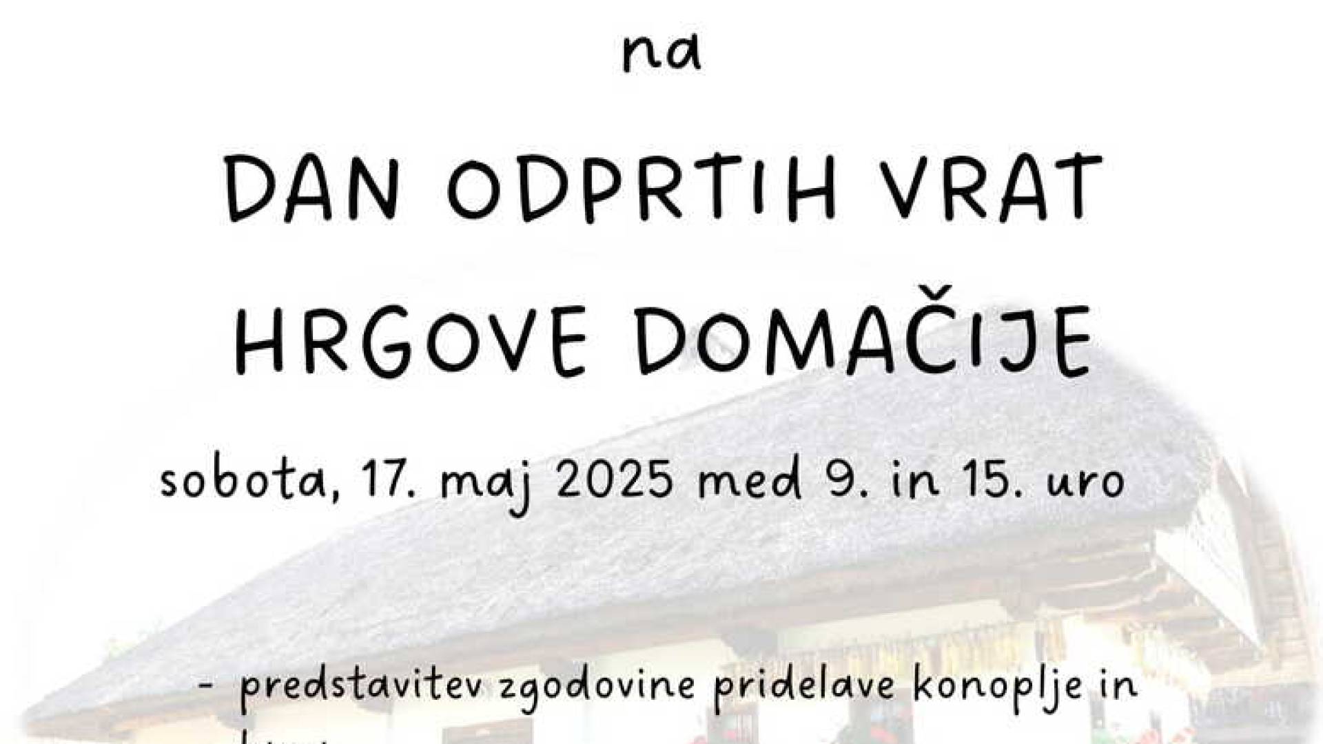 DAN ODPRTIH VRAT HRGOVE DOMAČIJE; sobota, 17.5.2025 med 9. in 15. uro; Hrgova domačija