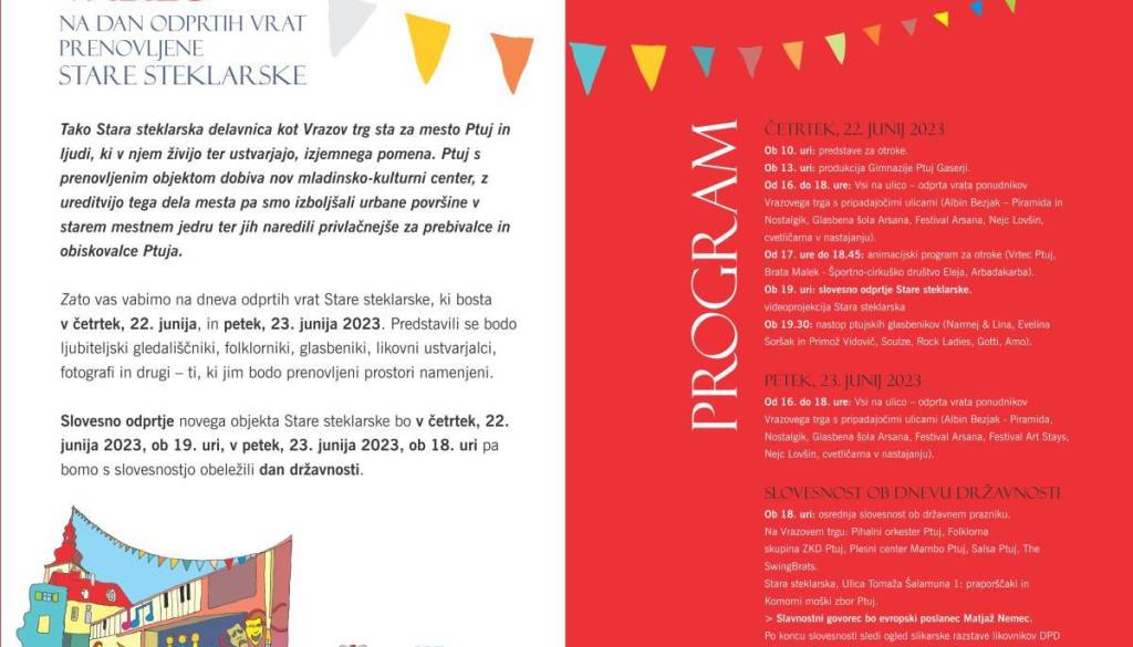Ulica Tomaža Šalamuna, 2250 PtujSlovesno odprtje novega objekta Stare steklarske bo v četrtek, 22. junija 2023, ob 19. uri