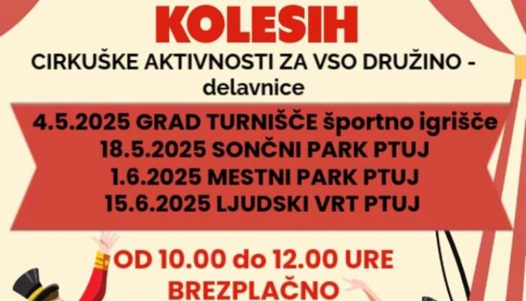 Vabljeni na cirkovške aktivnosti v CIRKUS NA KOLESIH z bratoma Malek in ŠCD Eleja. MESTNI PARK PTUJ, 1.6.2025, od 10. do 21. ure LJUDSKI VRT PTUJ, 15. 6. 2025 ...