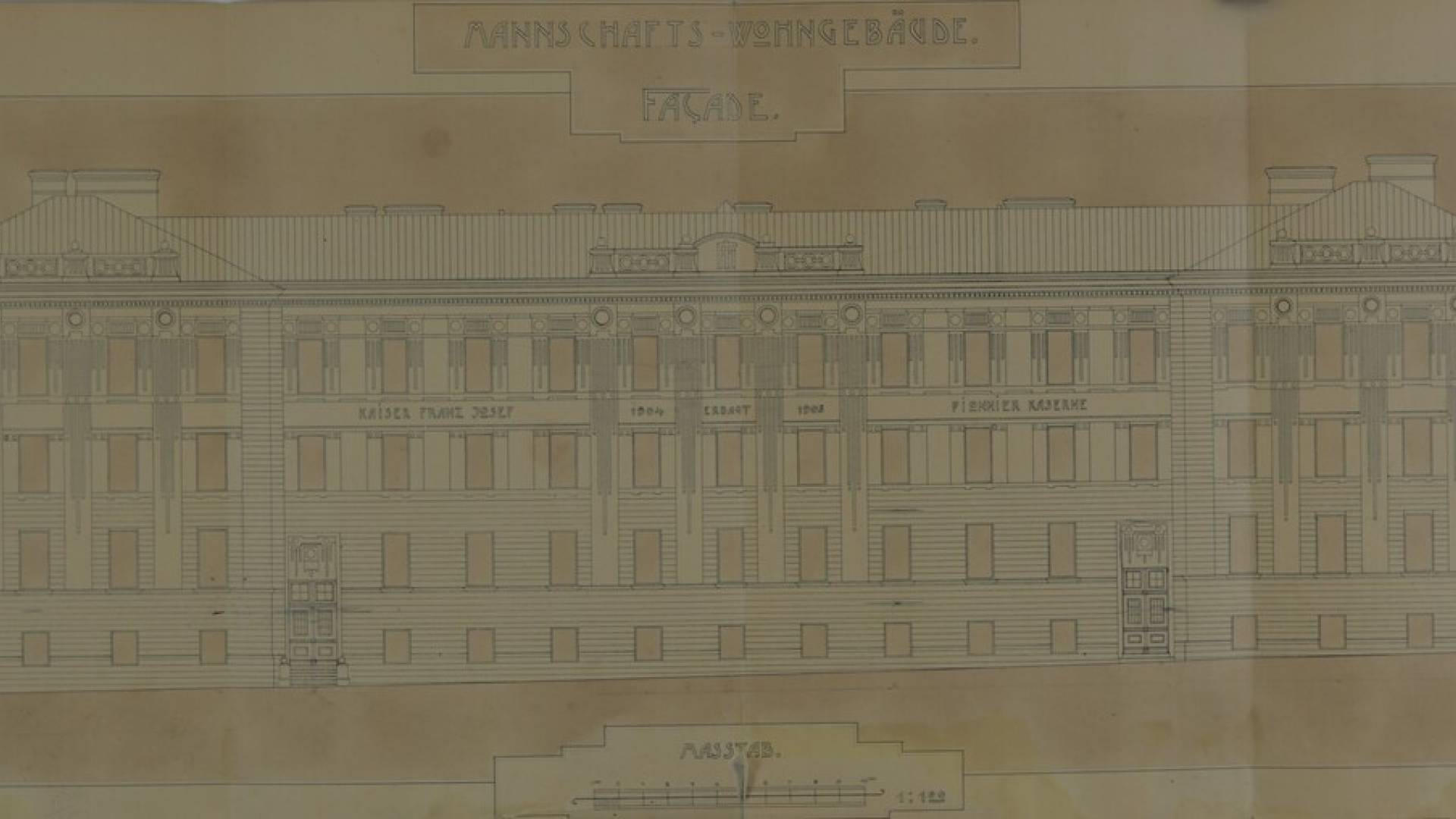 (Foto: Načrt fasade vojašnice na Vičavi iz leta 1904)