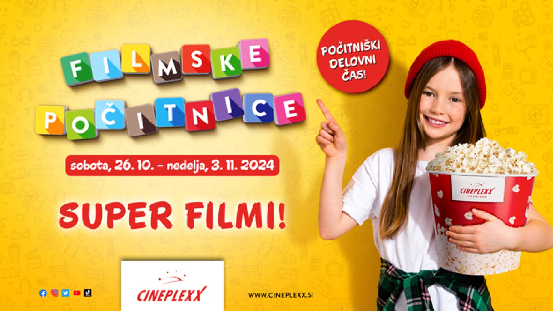 V času počitnic, od sobote 26.oktobra do nedelje, 3. novembra pripravljamo pester filmski program za otroke in družine že od 13. ure dalje. Najmlajše čaka tudi otroški kotiček s pobarvankami aktualnih risank.