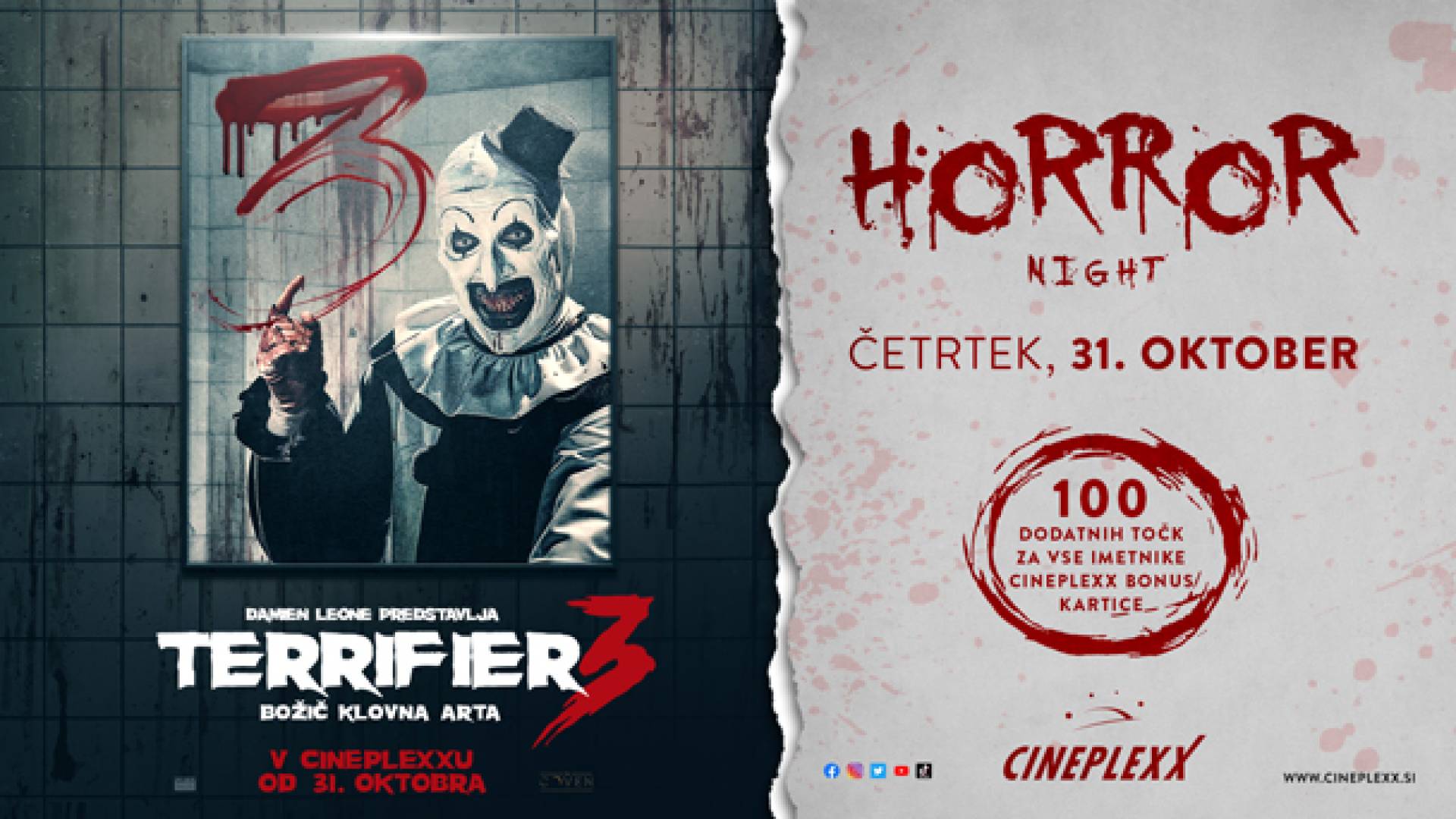 Cineplexx MariborPridruži se nam na Horror nightu s filmom TERRIFIER 3: BOŽIČ KLOVNA ARTA, ki bo v četrtek, 31. oktobra 2024! Imetnike naše CBC kartice bomo nagradili s 100 dodatnimi točkami!