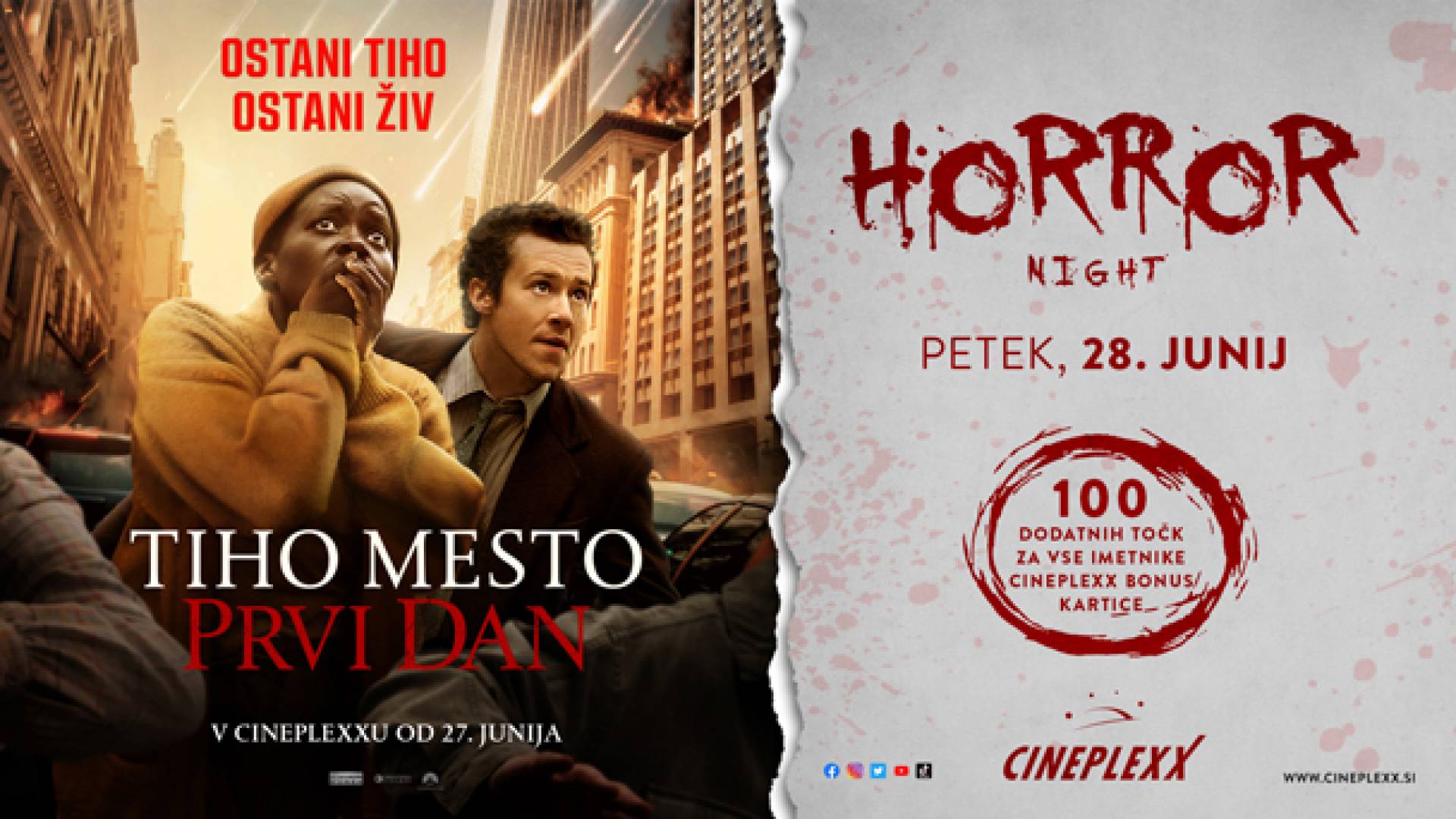Cineplexx MariborPridruži se nam na Horror nightu s filmom TIHO MESTO: PRVI DAN, ki bo v petek, 28. junija 2024! Imetnike naše CBC kartice bomo nagradili s 100 dodatnimi točkami!