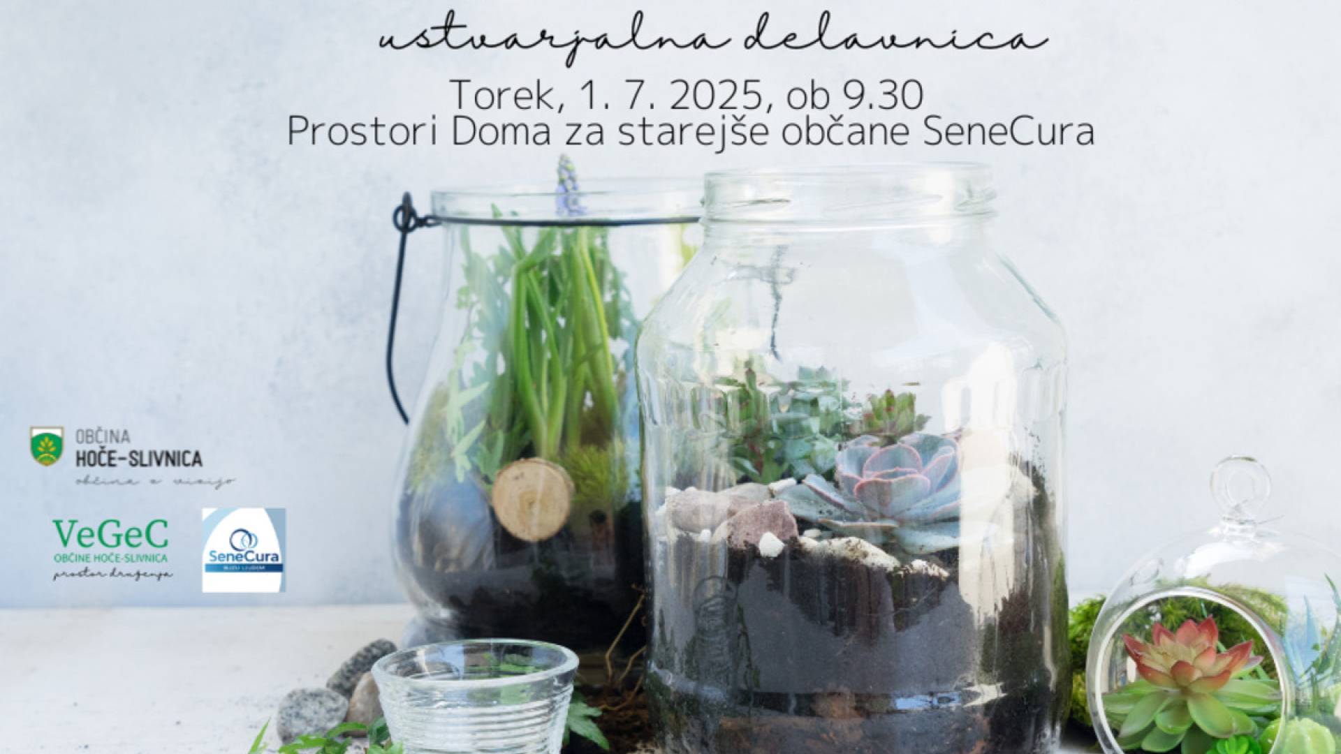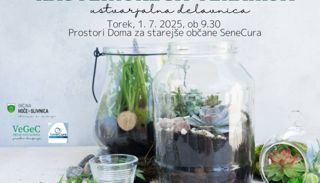 SeneCura Dom starejših občanov Hoče - SlivnicaVabimo vas na ustvarjalno delavnico izdelave rastlinskega terarija, ki bo v torek, 1. 7. 2025, ob 9.30 na lokaciji Doma za starejše občane Občine Hoče-Slivnica SeneCura v Slivnici.