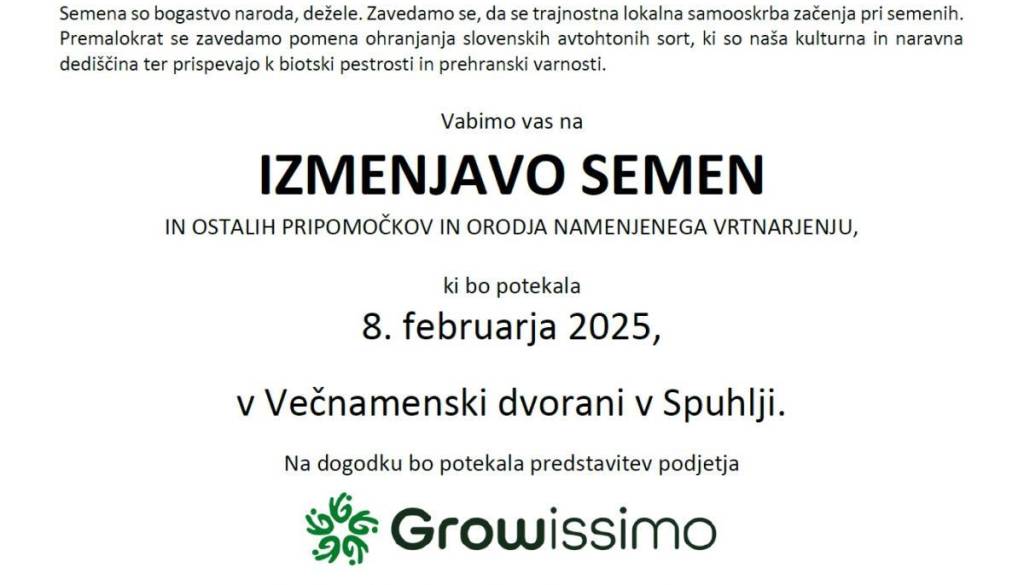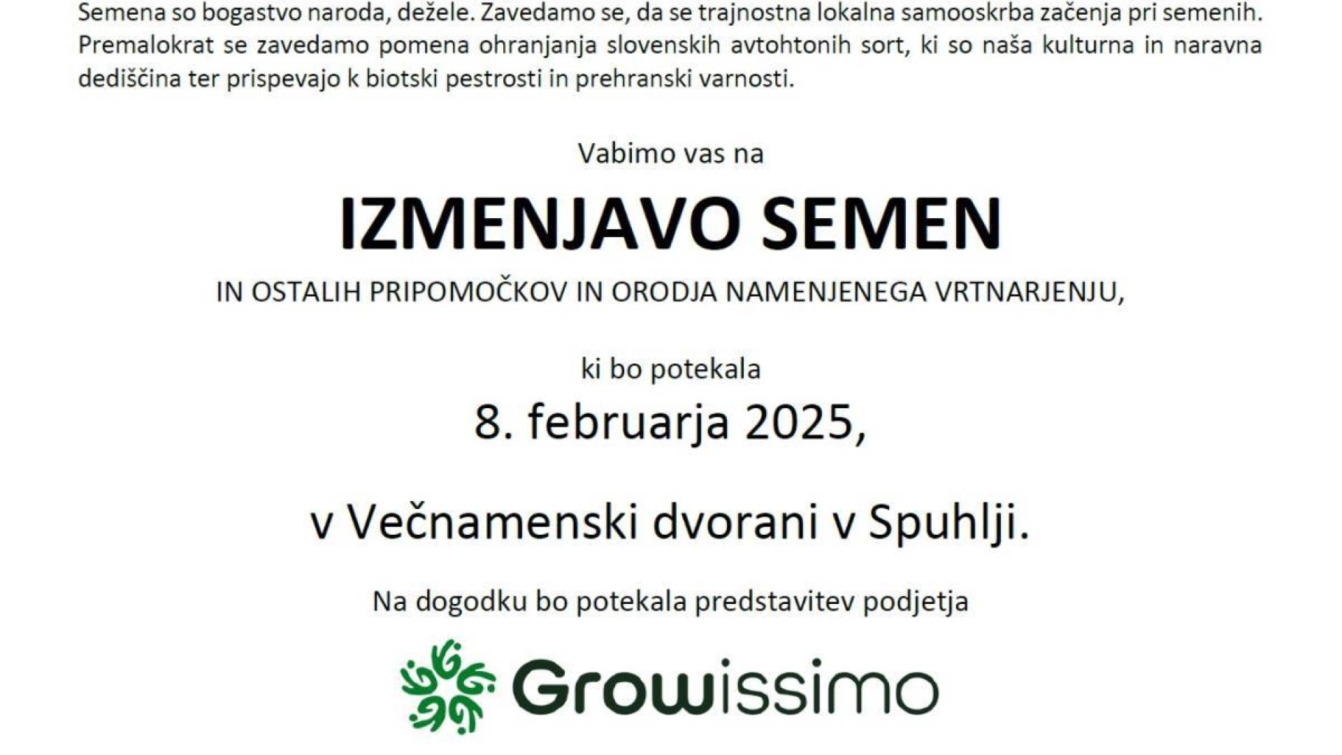 Večnamenska dvorana SpuhljaVabimo vas na IZMENJAVO SEMEN IN OSTALIH PRIPOMOČKOV ter ORODJA, NAMENJENEGA VRTNARJENJU, ki bo potekala 8. februarja 2025,
