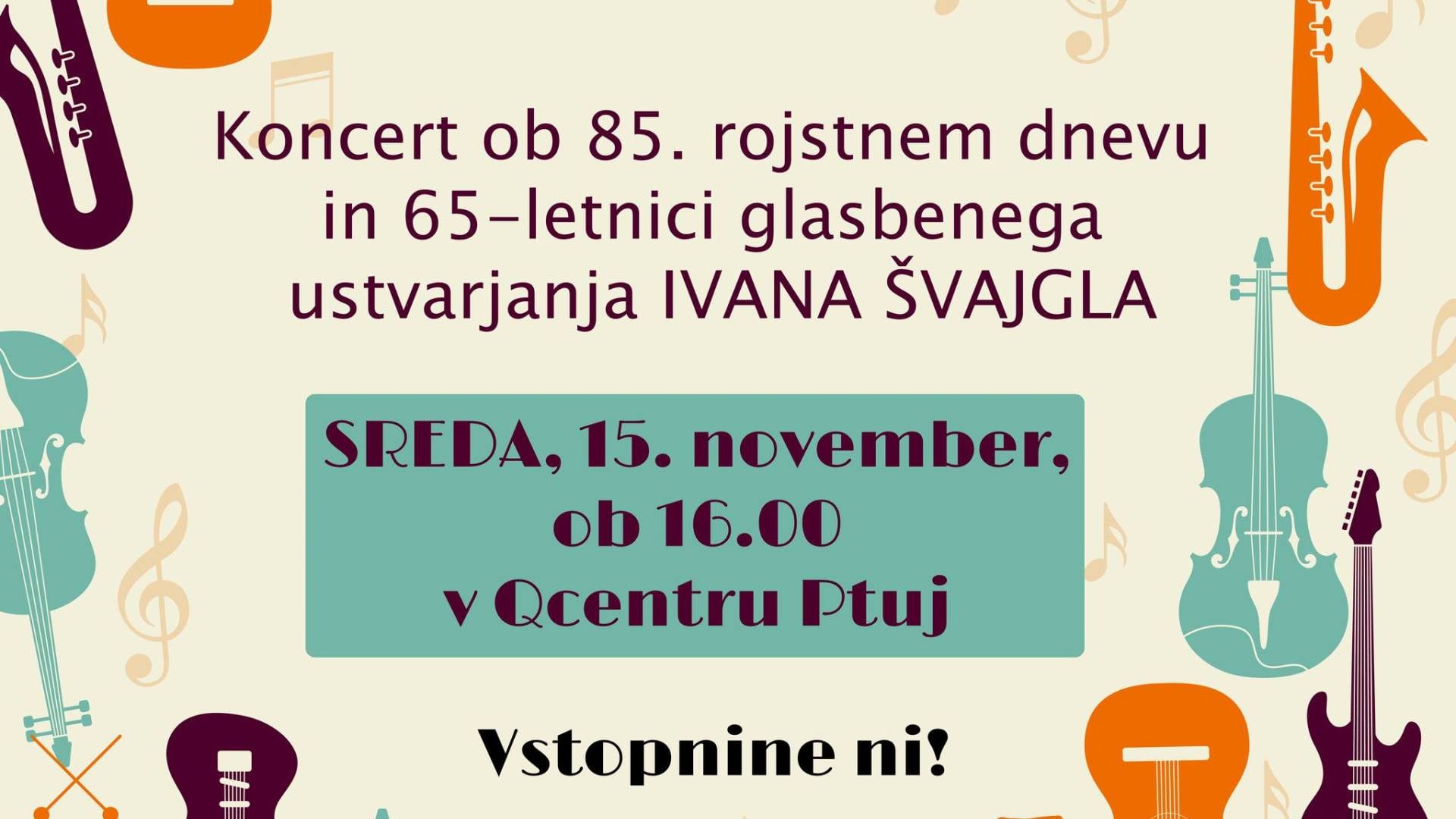 QCenter PtujSkupina prebivalcev Zavrča vabi na koncert ob 85. rojstnem dnevu in 65-letnici glasbenega ustvarjanja Ivana Švajgla. Nastopili bodo Rudi Šantl, Tanja Zajc Zupan, Nace Junkar in mnogi drugi. Vstopnine ni. Vabljeni, da se nam pridružite v Qcentru Ptuj, to sredo ob 16.00.