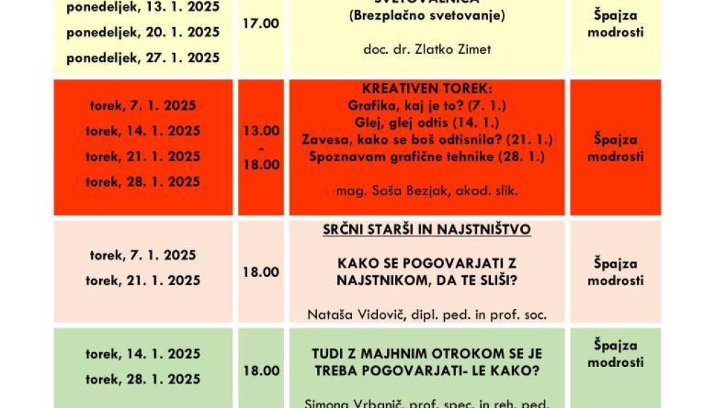 Ulica heroja Lacka 3, 2250 PtujLjudska univerza Ptuj in Center za družine Špajza modrosti vas vabita na BREZPLAČNE dogodke v mesecu JANUARJU 2025.