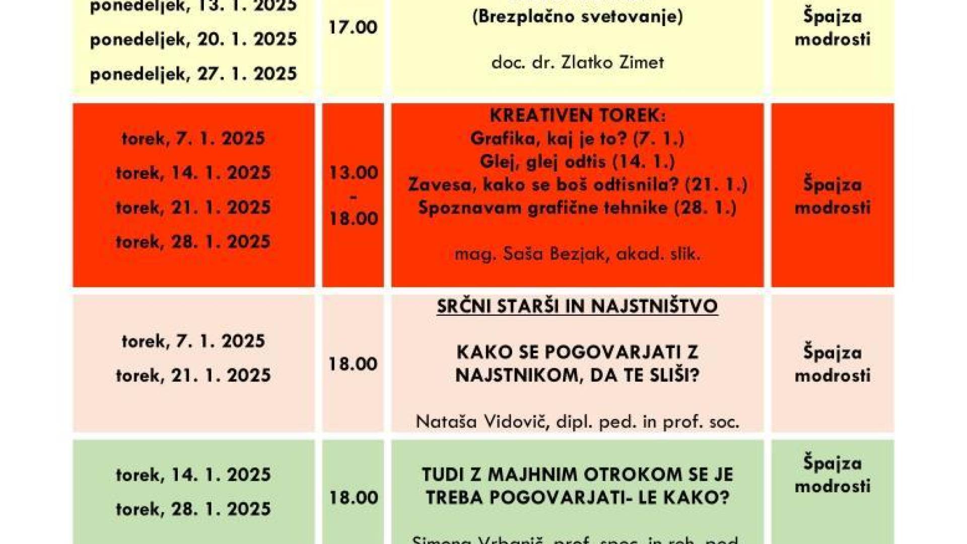 Ulica heroja Lacka 3, 2250 PtujLjudska univerza Ptuj in Center za družine Špajza modrosti vas vabita na BREZPLAČNE dogodke v mesecu JANUARJU 2025.