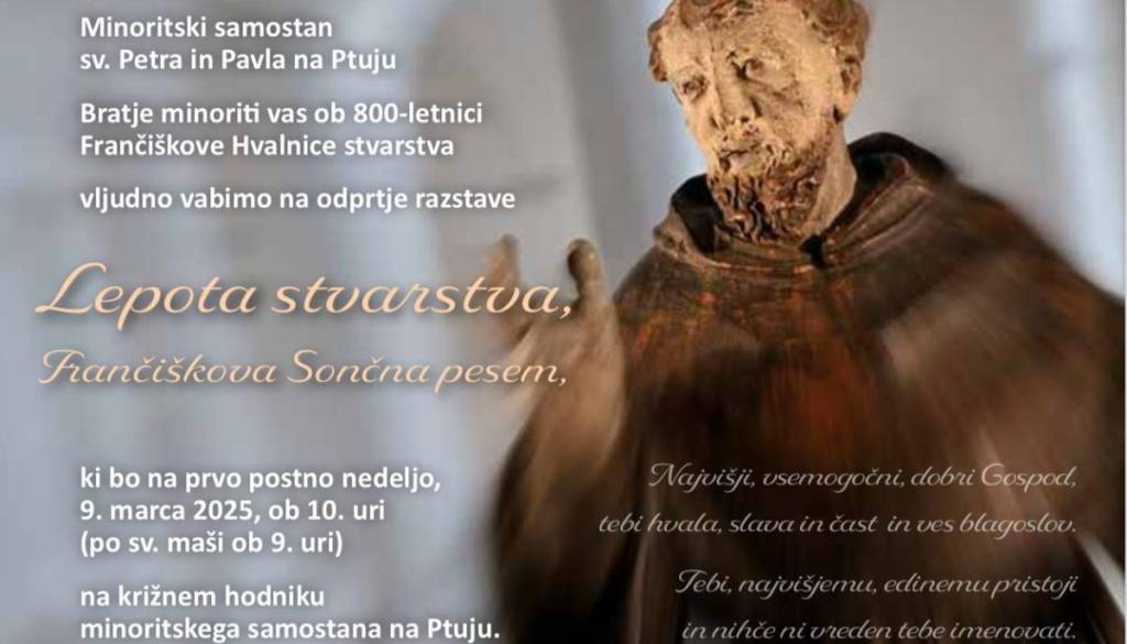 Bratje minoriti vas ob 800-letnici Frančiškove Hvalnice stvarstva vljudno vabijo na odprtje razstave Lepota stvarstva, Frančiškova Sončna pesem, ki bo na prvo postno nedeljo, 9. marca 2025, ob 10. uri (po sv. maši ob 9. uri)