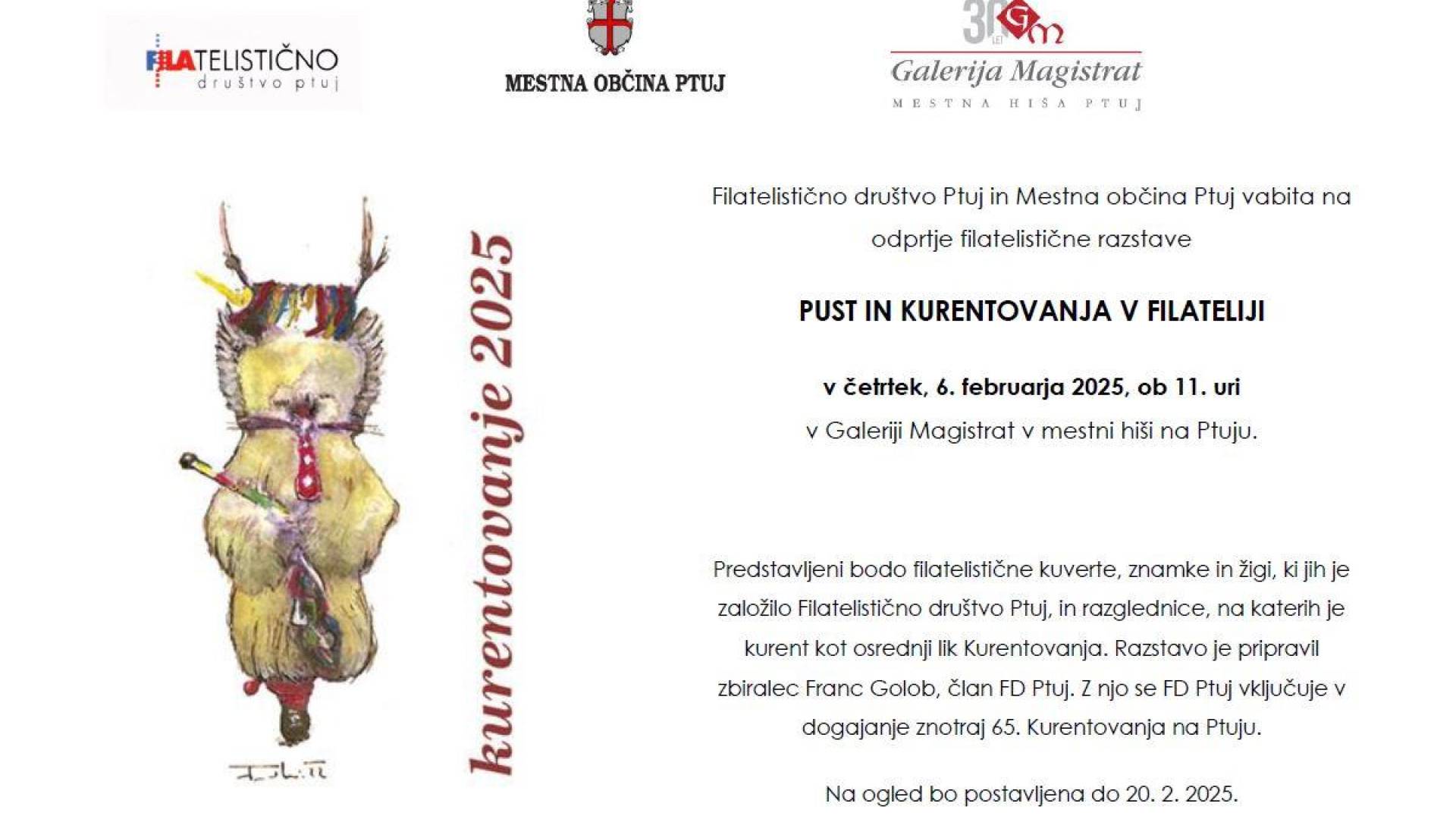 Galerija MagistratFilatelistično društvo Ptuj in Mestna občina Ptuj vabita na odprtje filatelistične razstave PUST IN KURENTOVANJA V FILATELIJI v četrtek, 6. februarja 2025, ob 11. uri v Galeriji Magistrat v mestni hiši na Ptuju.