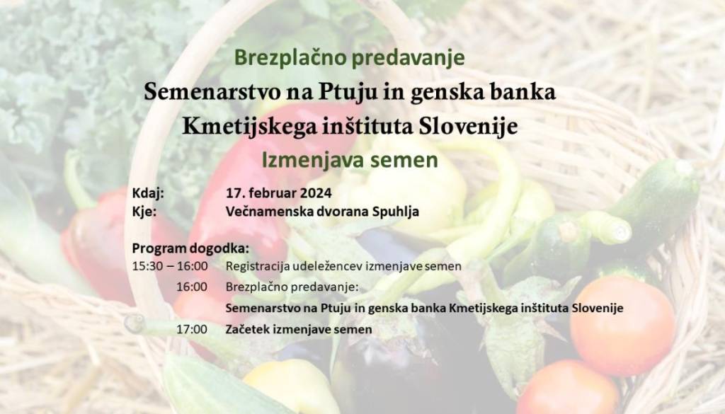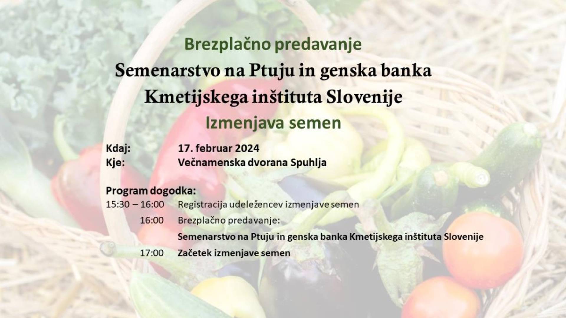 Večnamenska dvorana Spuhlja, Spuhlja 12aDruštvo gospodinj Spuhlja Marjetica in Društvo podeželskih žena občine Markovci vabita na predavanje Semenarstvo na Ptuju in genska banka Kmetijskega inštituta Slovenije (predavatelj: Darko Vernik, vodja Infrastrukturnega centra Ptuj, Kmetijski inštitut Slovenije) ter izmenjavo semen, ki bosta potekala 17. februarja 2024 v Večnamenski dvorani v Spuhlji.