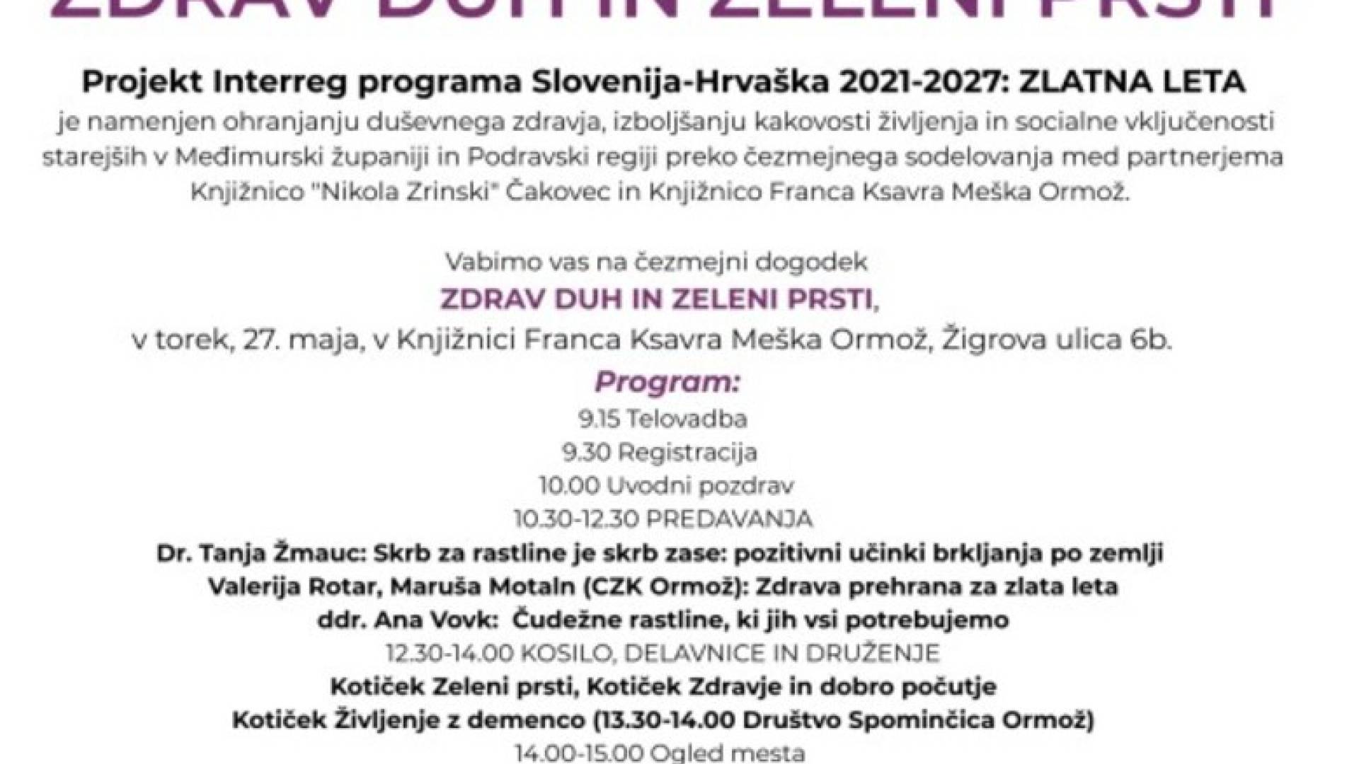 V torek 27. maja bomo v okviru projekta pri nas pripravili dogodek z naslovom Zdrav duh in zeleni prsti. Na dogodek se lahko prijavite v knjižnici, na telefonski številki: 02 / 741 55 84 ali na elektronskem [email protected]