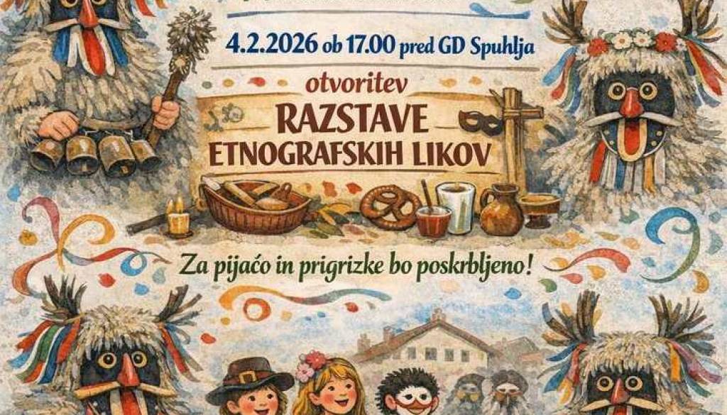 ▶ 4. 2. 2026 ob 17. uri otvoritev razstave etnografskih likov, ki so značilni za Spuhljo. Razstava bo na ogled v šotoru pred Večnamensko dvorano Spuhlja med 4. 2. in 16. 2. 2026.