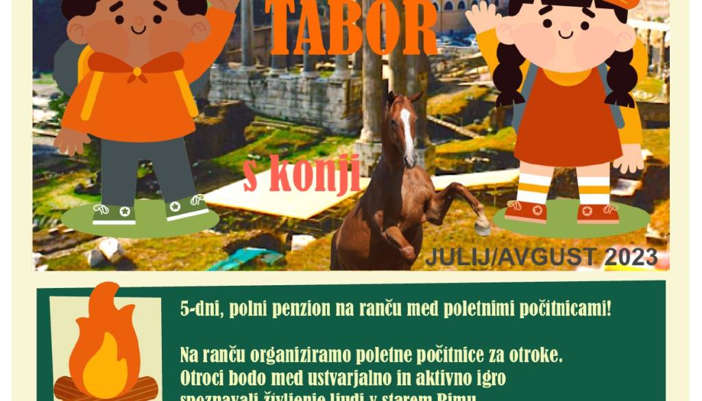 Konjeniški klub Jezero, Spuhlja 122Primerno za otroke od 6. do 14. let – julij, avgust 2023 Konjeniški kljub Jezero, Spuhlja 122, 2250 Ptuj POLETNE POČITNICE ZA OTROKE Na ranču ob jezeru v bližini starega slovenskega mesta Ptuja, v rimskem času so mu rekli Petovio, organiziramo poletne počitnice za otroke. Otroci bodo med ustvarjalno in aktivno igro spoznavali življenje ljudi v starem Rimu: - spoznavali bodo rimske šole, rimsko pisavo, se naučili nekaj besed latinščine, - fantje se bodo zagotovo zanimali za rimsko vojsko in gladiatorje ali pa za rimsko gradbeništvo. Gradili bomo mostove in zidovja. - dekleta morda zanimajo rimski plesi in glasba, rimska prehrana in rimska kuhinja, rimska oblačila in rimsko lepotičenje, rimska kozmetika. - uprizorili bomo rimsko gledališko predstavo, tiskali rimske časopise, izdelali mozaik, ... - spoznali bomo rimski cirkus s konji in jahanje. Ne gre za šolo ali tečaj jahanja. Otroci imajo med drugimi ustvarjalnimi vsebinami stik s konjem, ga spoznavajo v njegovem okolju in se imajo možnost preizkusiti jahati ali pa pomagati pri oskrbi konj. Prihod na tabor in sprejem otrok je med 8. in 9. uro zjutraj, odhod je v petek ob 17. uri. Cena 5-dnevnega tabora je 300,- EUR, dnevno varstvo (07:00-17:00 ure): 40,- EUR V ceno je vključeno: - celotedensko bivanje v taboru (pon.-pet.) + zavarovanje - animacije, ustvarjalne delavnice dopoldan in popoldan po izbiri otrok - učenje začetnega jahanja konjev - polni penzion, napitki in sadje čez dan - spanje na seniku Potrebna je spalna vreča. Počitnice izvajamo v podeželskem okolju in med živalmi, zlasti konji, zato je potrebna temu primerno oblačilo in obutev za različne vremenske okoliščine. Sanitarije in umivalnice so urejene. termini: 3.-7., 10.-14., 17.-21., 24.-28. julij 31.7.-4.8., 7.-11., 14.-18., 21.-25. avgust