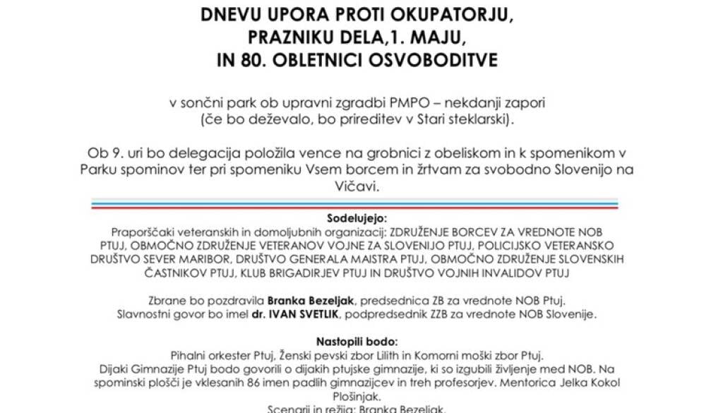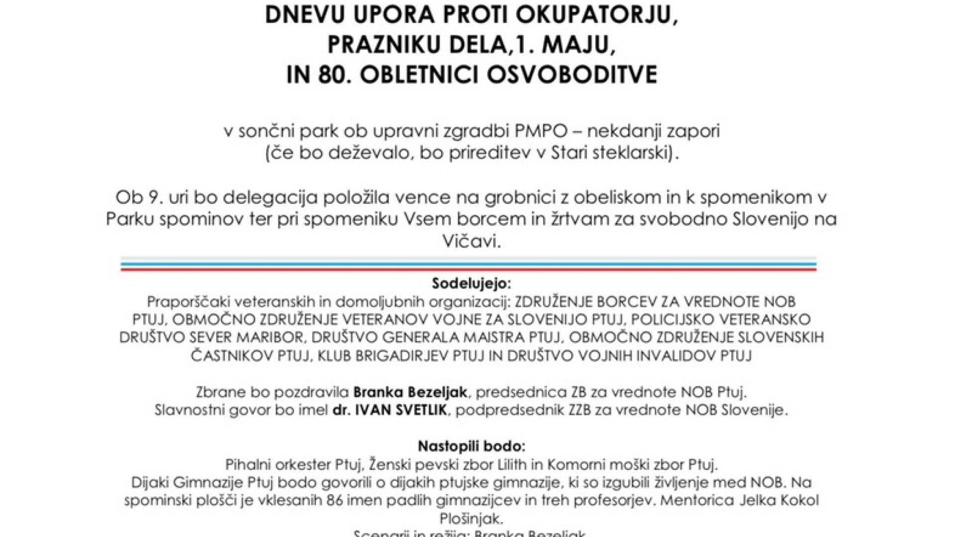 Sončni parkMestna občina Ptuj in Združenje borcev za vrednote NOB Ptuj vabita v nedeljo, 27. aprila 2025, ob 10. uri na slovesnost ob DNEVU UPORA PROTI OKUPATORJU, PRAZNIKU DELA, 1. MAJU, IN 80. OBLETNICI OSVOBODITVE v sončni park ob upravni zgradbi PMPO – nekdanji zapori (če bo deževalo, bo prireditev v Stari steklarski).