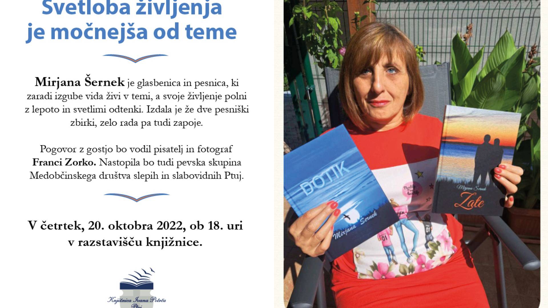 Pogovor z gostjo bo vodil pisatelj in fotograf Franci Zorko. Nastopila bo tudi pevska skupina Medobčinskega društva slepih in slabovidnih Ptuj.