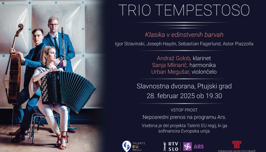 Ptujski grad v sodelovanju s Pokrajinskim muzejem Ptuj Ormož organizira koncert Tria Tempestoso. Zasedbo sestavljajo trije izjemni mladi glasbeniki: klarinetist Andraž Golob, violončelist Urban Megušar in harmonikarica Sanja Mlinarič, ki študirajo in večinoma tudi delujejo v tujini. Izvedli bodo pisan program tako skladb napisanih za to zasedbo kot tudi priredb klasičnih del.