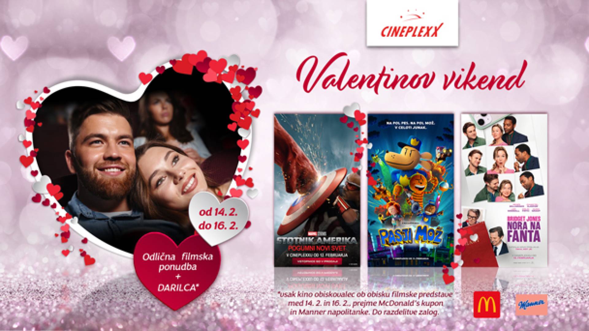 Za popolno romantično kino doživetje v dvoje pa bomo obiskovalce obdarili s sladkim presenečenjem Manner* in McDonald's* kuponom za McSundae sladoled.