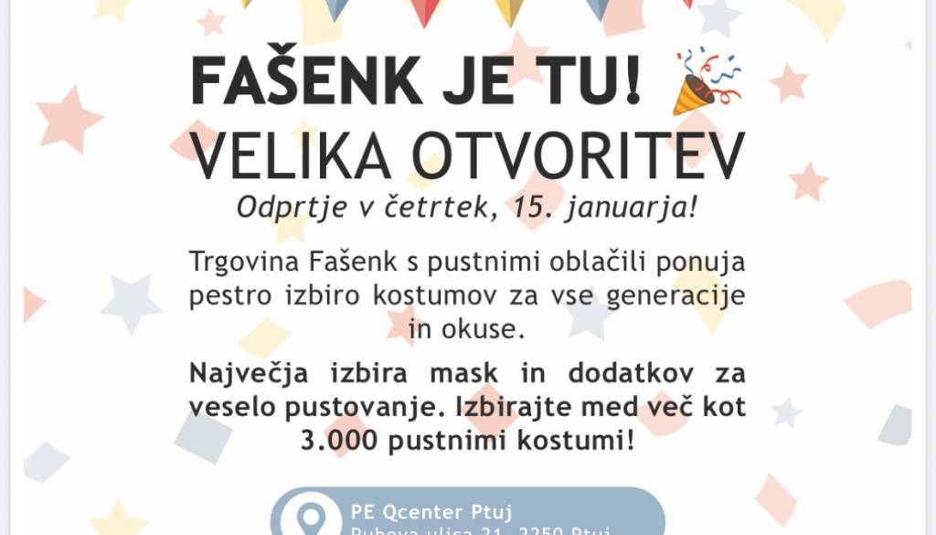Vabljeni na veliko otvoritev trgovine FAŠENK, kjer vas čaka pestra izbira pustnih kostumov, mask in dodatkov za vse generacije in okuse! 🥳