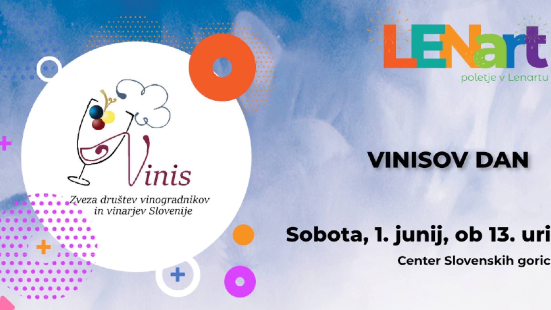 CENTER SLOVENSKIH GORIC, TRG OSVOBODITVE 9, LENARTVabljeni na vinsko- kulinarično doživetje z dotikom glasbe: razglasitev rezultatov 7. ocenjevanja vin Združenja Vinis, degustacije vin, kulinarična ponudba domačih dobrot, nastopajo: Eva in Matic Lorbek, Slovenskogoriški glasovi in Alfi Nipič.
