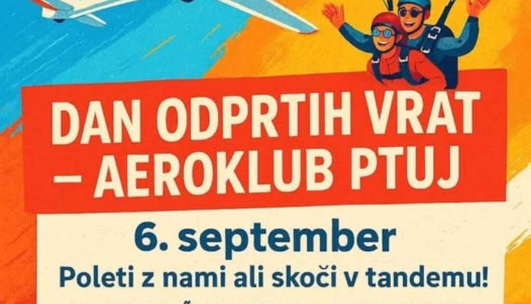 Vabljeni na dan odprtih vrat Aerokluba Ptuj! Doživite nebo z nami! Poletite z jadralnim ali motornim letalom, skočite v tandem s padalom, spoznajte naša letala ...