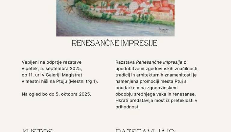 Vabljeni na odprtje razstave Renesančne impresije, ki bo v petek, 5. 9. 2025, ob 11. uri v Galeriji Magistrat v mestni hiši na Ptuju. Na dogodku bodo nastopili ...