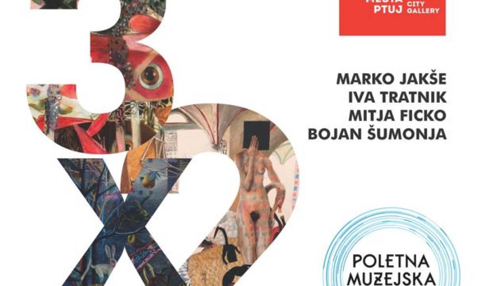 Galerija mesta PtujVljudno vabljeni na voden ogled po razstavi 3x2: Marko Jakše, Iva Tratnik, Mitja Ficko, Bojan Šumonja; pod vodstvom kustosa razstave Dušana Fišerja v soboto, 17. junija 2023, ob 18.uri v okviru Poletne muzejske noči. Ta dan bo Galerija mesta Ptuj bila odprta od 10. do 24. ure.