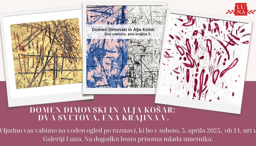 Galerija LunaVljudno vas vabimo na voden ogled po razstavi, ki bo v soboto, 5. aprila 2025, ob 11. uri v Galeriji Luna. Voden ogled bo vodila kustosinja Doroteja Kotnik v pogovoru z Aljo Košar in Domnom Dimovskim.