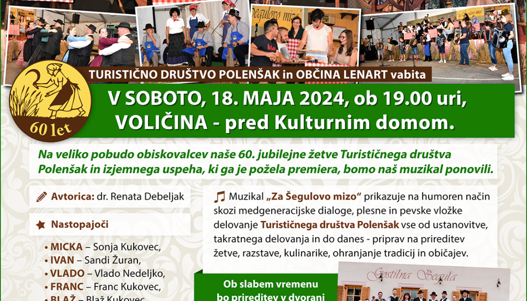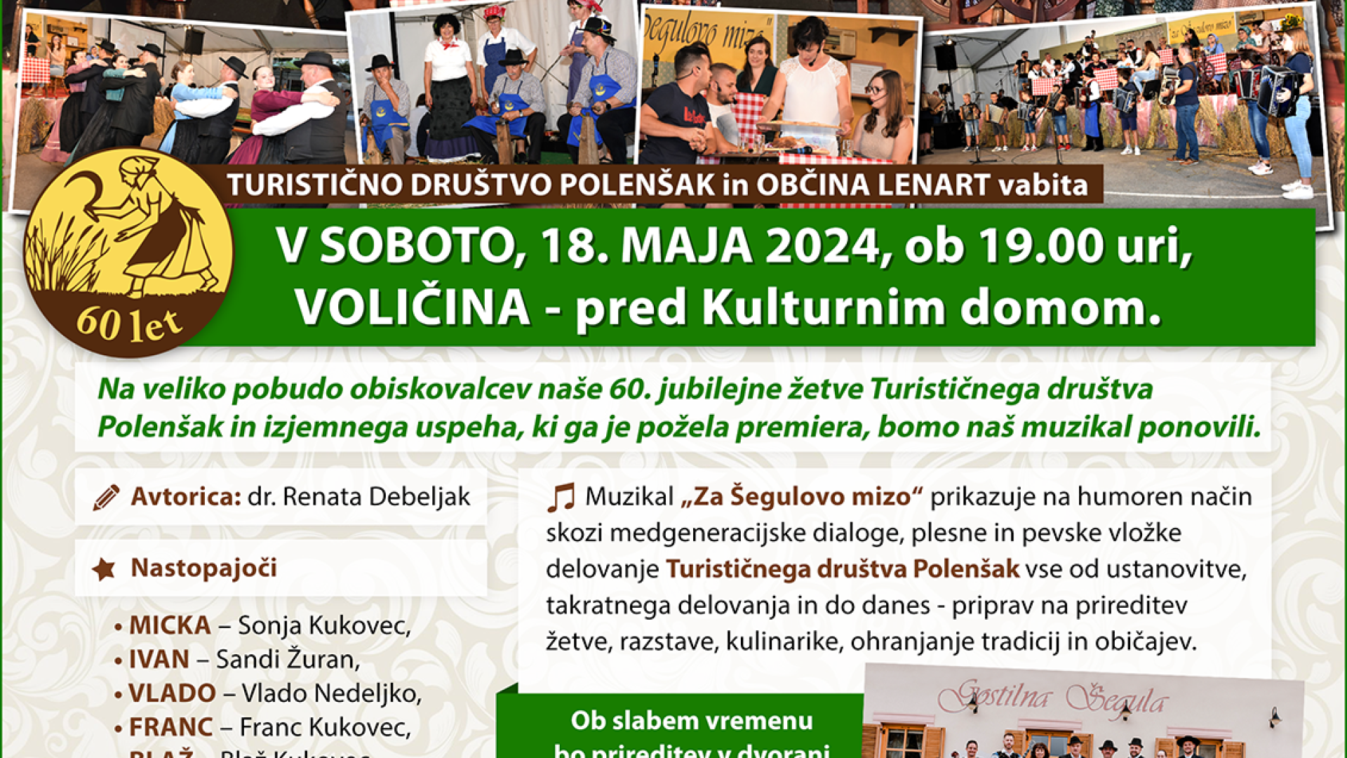 CENTER VOLIČINEMuzikal „Za Šegulovo mizo“ prikazuje na humoren način skozi medgeneracijske dialoge, plesne in pevske vložke delovanje Turističnega društva Polenšak vse od ustanovitve, takratnega delovanja in do danes - priprav na prireditev žetve, razstave, kulinarike, ohranjanje tradicij in običajev. Avtorica: dr. Renata Debeljak