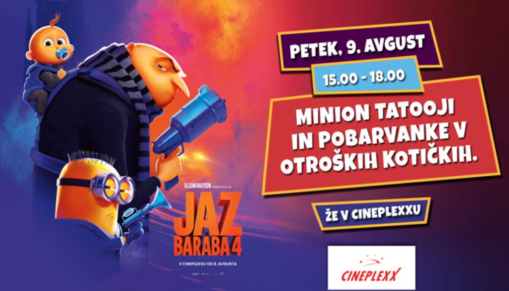 Cineplexx MariborV petek, 9. avgusta 2024, bo v Cineplexxu Maribor med 15:00 in 18:00 uro, poskrbljeno za zabavo v otroških kotičkih, kjer bomo zraven super pobarvank izdelovali še minion tattooje!