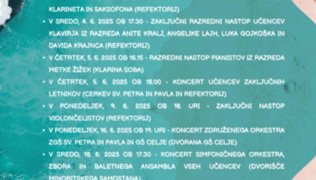 ZAKLJUČNI NASTOP VIOLONČELISTOV, gregor1 | 9. junij 2025 07:42 v Glasba Termin Ponedeljek, 9. junij 2025 18:00 Lokacija Zasebna glasbena šola v samostanu sv. Petra in Pavla Ptuj ZAKLJUČNI NASTOP VIOLONČELISTOV