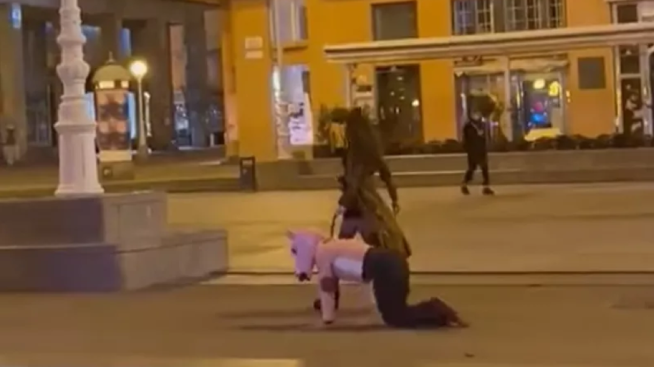 Gre za videoposnetek, ki je bil objavljen na TikToku, posnet pa je bil na Cvjetnem trgu v Zagrebu. In sicer prikazuje nenavadni prizor, kako je moški žensko sprehajal kar na povodcu in v nenavadni maski konja.