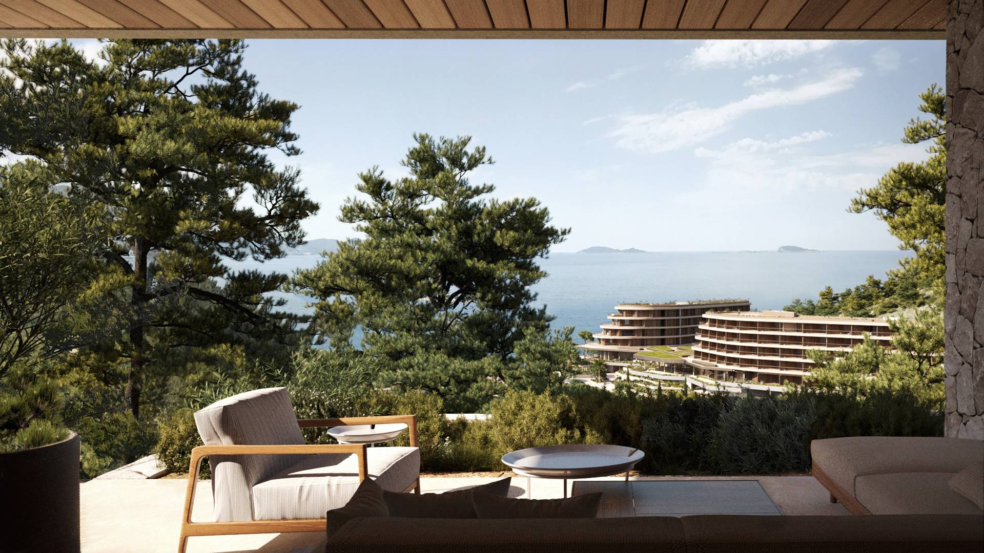 Obstoječe hotelske strukture na vznožju pobočja na obeh straneh parcele bodo prenovljene po visokih standardih, z enim petzvezdičnim hotelom na eni strani ter 32 apartmaji in 4 vilami na drugi strani. Zelene strehe in velike steklene površine na fasadah bodo omogočile, da se nastanitvene enote popolnoma zlijejo z naravnim okoljem.