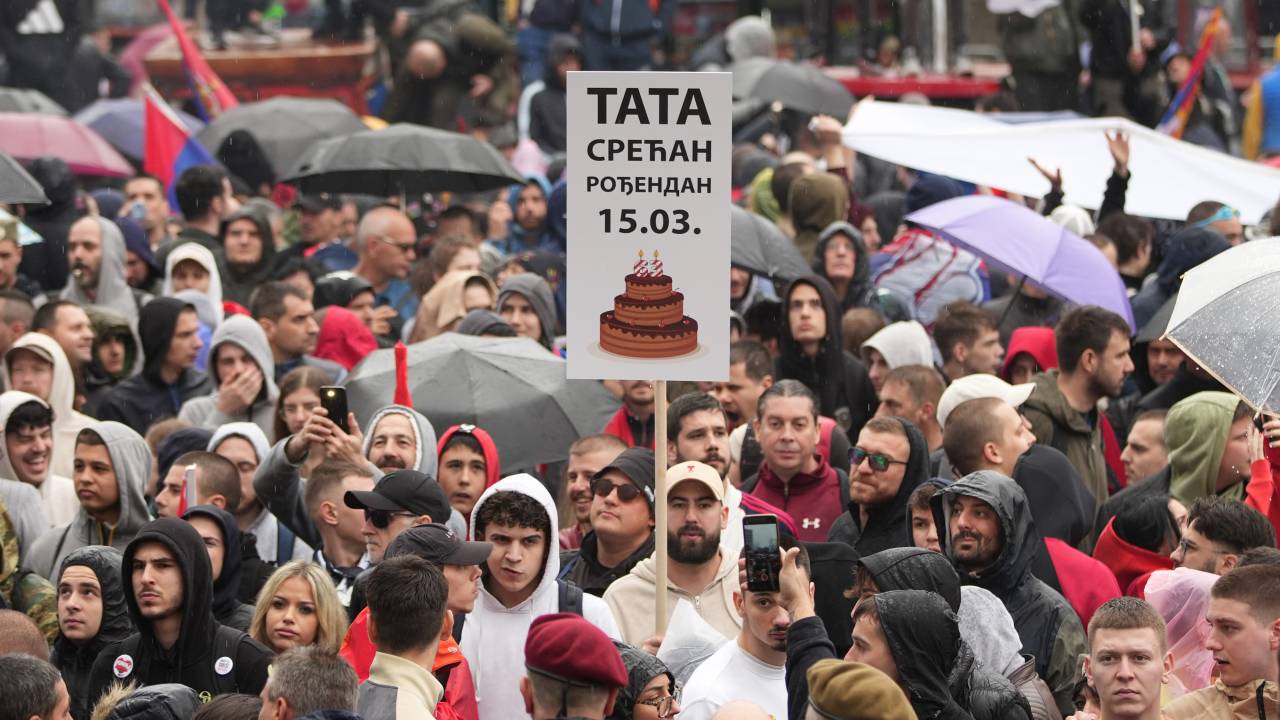 Na protestu v Beogradu kljub dežju velika množica.