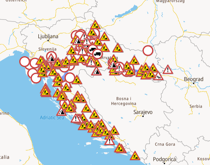 Stanje na hrvaških cestah (vir: Posnetek zaslona/HAK.hr).