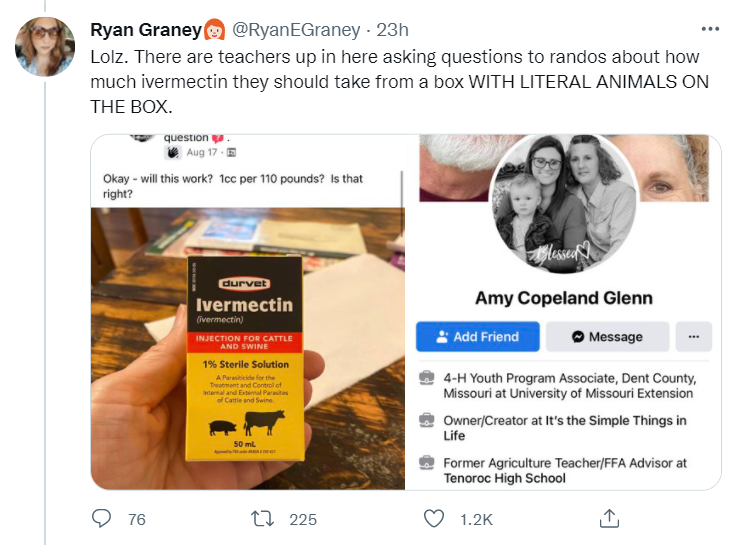 Ryan Graney je objavila tudi sliko samega ivermektina, na kateri lahko vidimo svinjo in govedo. »Tukaj so tudi učitelji, ki postavljajo vprašanja o tem, koliko ivermektina morajo vzeti, četudi so na škatli dejanske živali,« piše Graneyjeva.