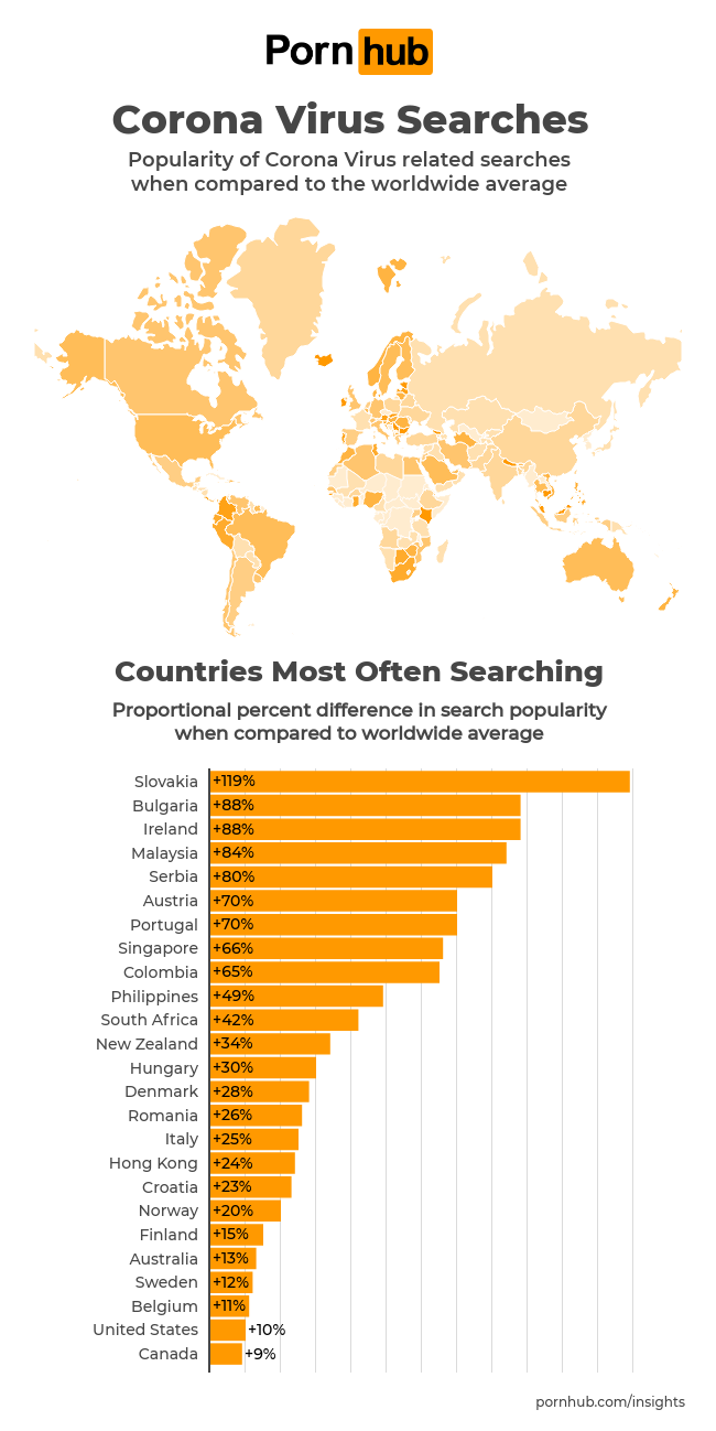 V primerjavi s tujino obiskovalci Pornhuba iz Slovaške za 119 odstotkov raje iščejo po koronavirusu na Pornhubu kot ostale države. Iskanje je več kot 80 odstotkov bolj priljubljeno v Bolgariji, na Irskem, v Maleziji in Srbiji. Slovenije na lestvici ni, se je pa iskanje po koronavirusu na Pornhubu povečalo pri naših hrvaških sosedih, in sicer za 23 odstotkov.