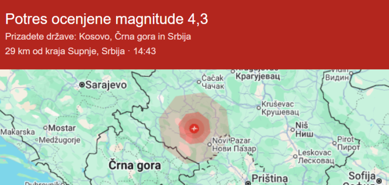 Danes popoldne, ob 14.43, je Balkan stresel potres ocenjene magnitude 4,3.