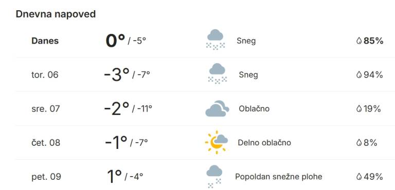 Najvišje dnevne temperature bodo večinoma med minus štiri in nič stopinjami Celzija, na Goriškem in v Slovenski Istri pa okoli pet stopinj.