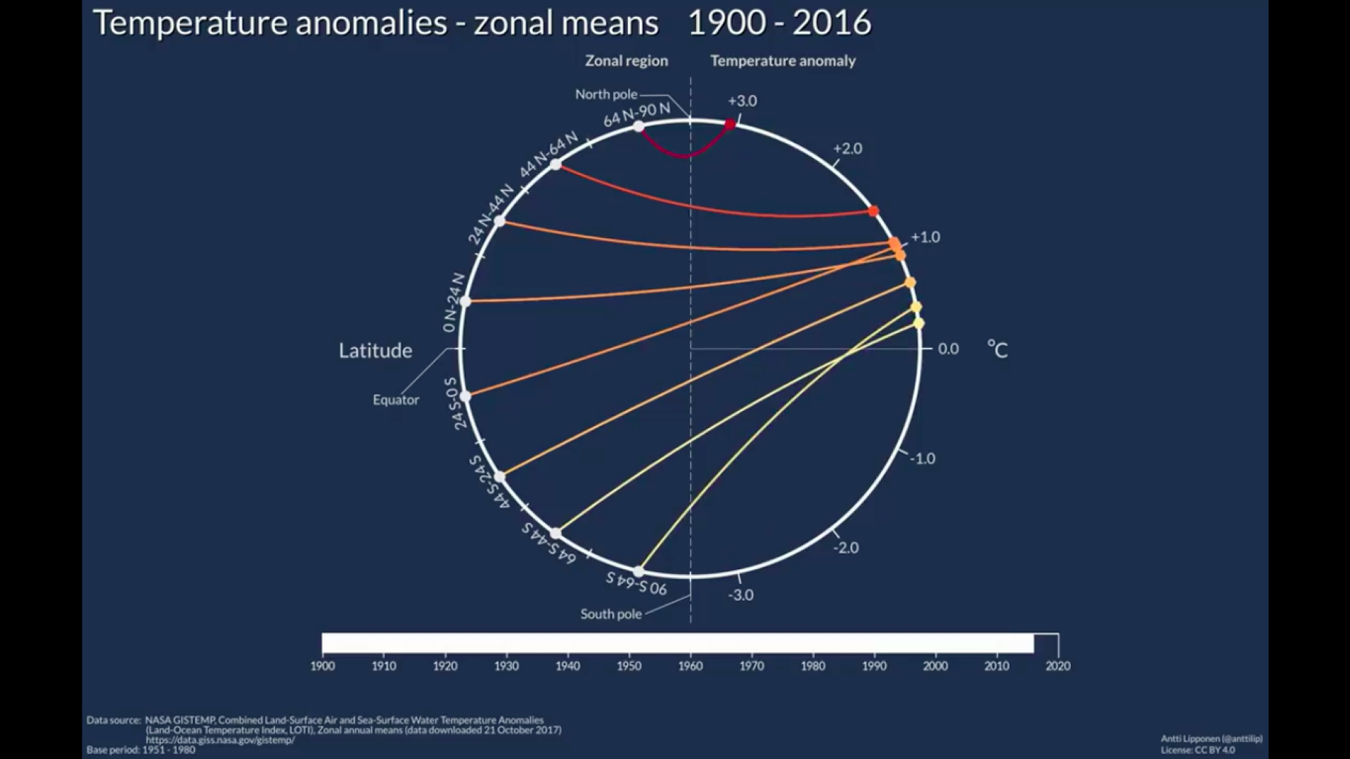 Ameriška vesoljska agencija NASA je pred kratkim objavila animirani posnetek, ki prikazuje spremembo povprečnih temperatur v posameznih zemljepisnih širinah od leta 1900 do leta 2016. Posnetek zelo nazorno prikazuje, da se je povprečna temperature dvignila v vseh zemljepisnih širinah, a daleč najbolj v severnem polarnem krogu. Povprečna temperatura v območju med 46. vzporednikom in severnim tečajem se je dvignila za več kot 3 ºC