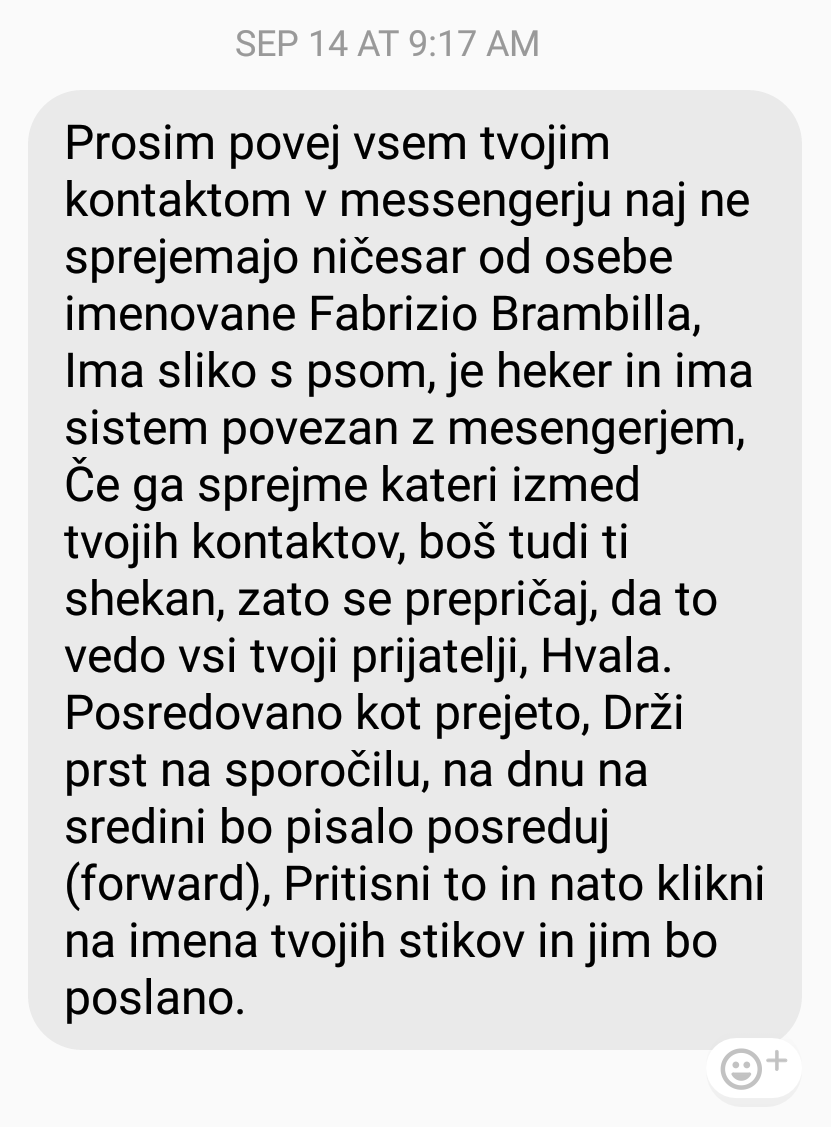 Panika je zavladala tudi, ko so po Facebook Messengerju zaokrožila številna opozorila o nevarnem hekerju Fabriziu, kjer je šlo za že večkrat videno potegavščino, od katere posamezniki, ki jo pričnejo, nimajo nič. Varni na spletu svetujejo, da če o »dobronamernosti sporočila« niste prepričani, le vnesite del besedila v iskalnik in boste hitro našli razlago, ki bo pojasnila potegavščino.